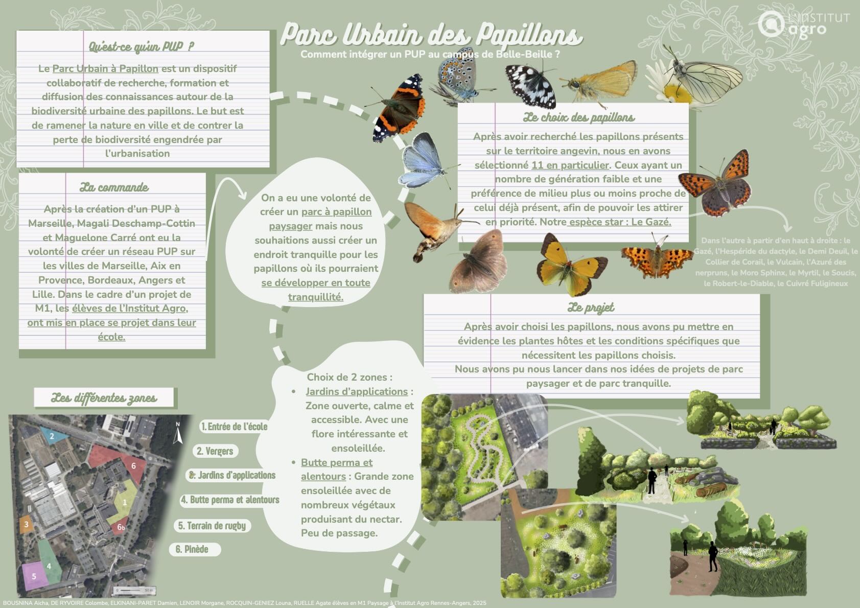 Dans le cadre d’un projet pédagogique mené Adeline Bulot, Véronique Beaujouan, Hervé Daniel de l’Institut Agro Rennes-Angers, des étudiants ont été amenés à travailler sur la conception d’un Parc Urbain des Papillons (PUP+) sur leur propre campus. La classe a été divisée en trois groupes, chacun ayant proposé un projet distinct, reflétant des visions complémentaires et créatives de l’aménagement du site.