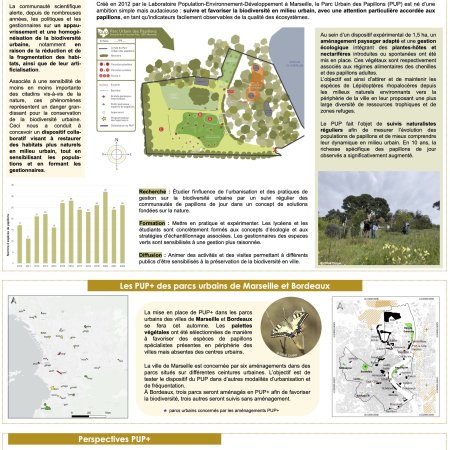 Afin de suivre cette biodiversité urbaine sur le long terme et de comprendre son évolution, le Laboratoire Population Environnement Développement (LPED) met en place en 2012 un dispositif expérimental de recherche unique en France : le Parc Urbain des Papillons (PUP). Il s'agit de créer une zone attractive et un havre de paix pour les papillons au coeur de la deuxième Ville de France. C'est cette démarche que nous souhaitons partager.